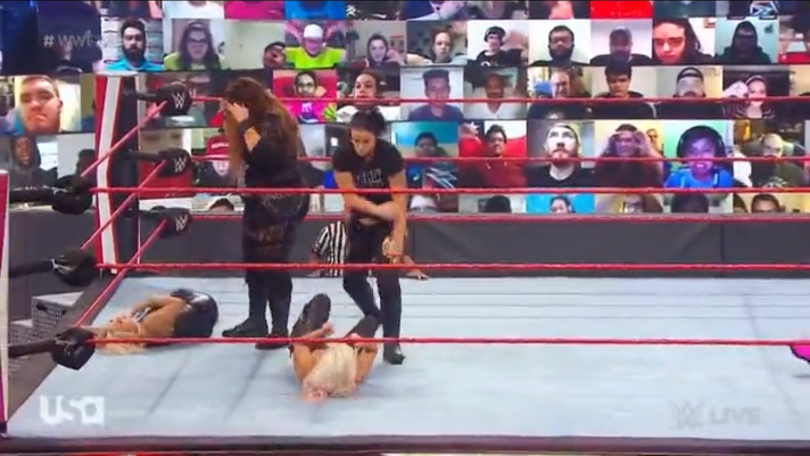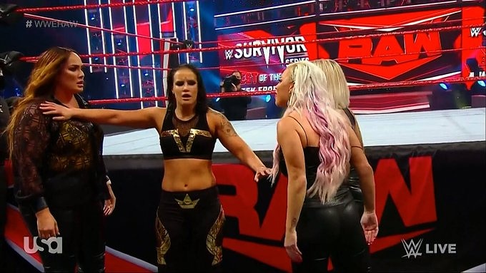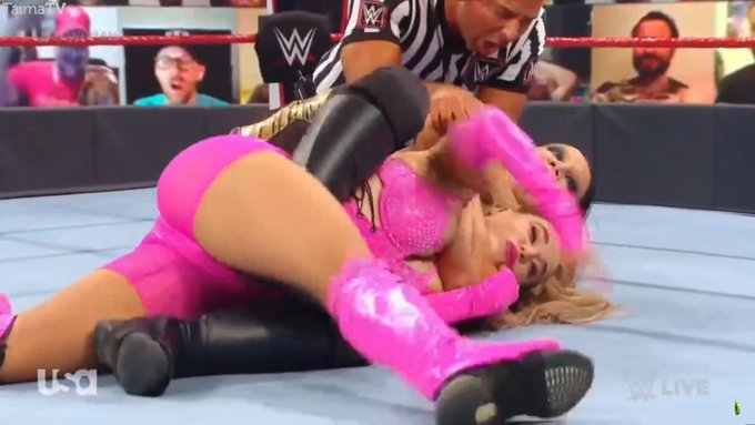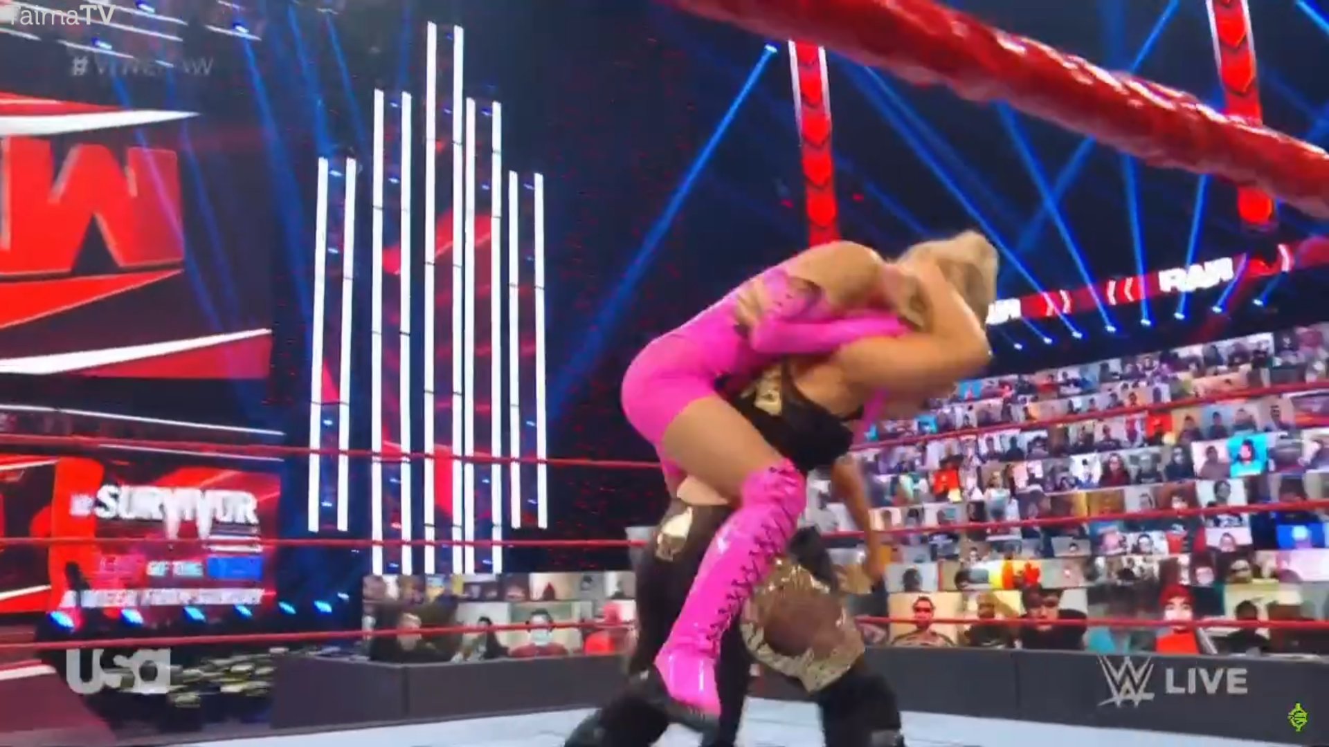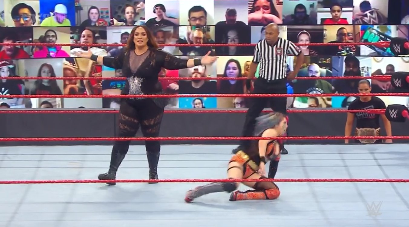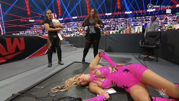 Nia Jax y Asuka forcejean en el ring y Asuka buscaba el Asuka Lock, pero Shayna Baszler ingresa y patea a la Campeona Raw logrando la descalificación.