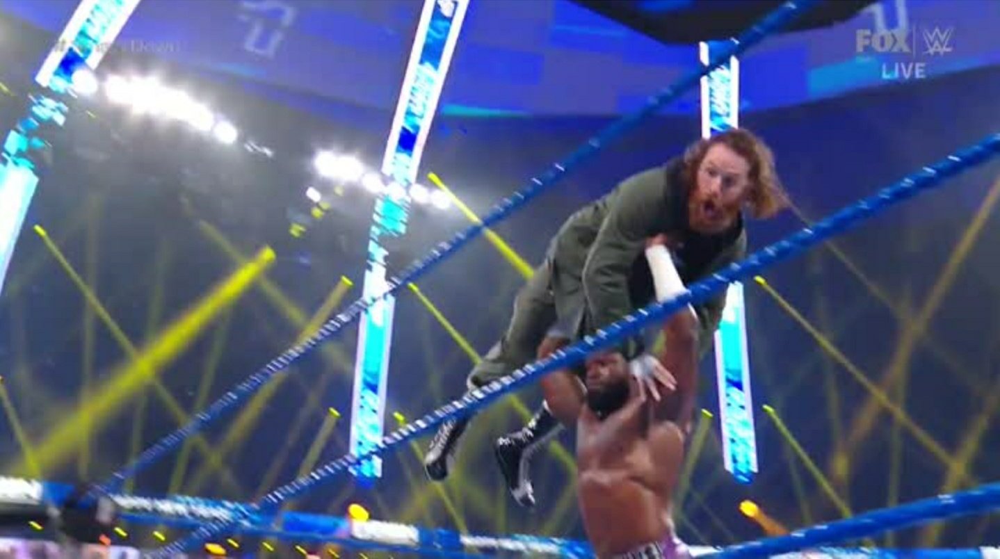 En el ring, Apollo Crews conecta un enzuigiri y remata a Sami con el Sit Down Powerbomb para lograr la cuenta de tres.