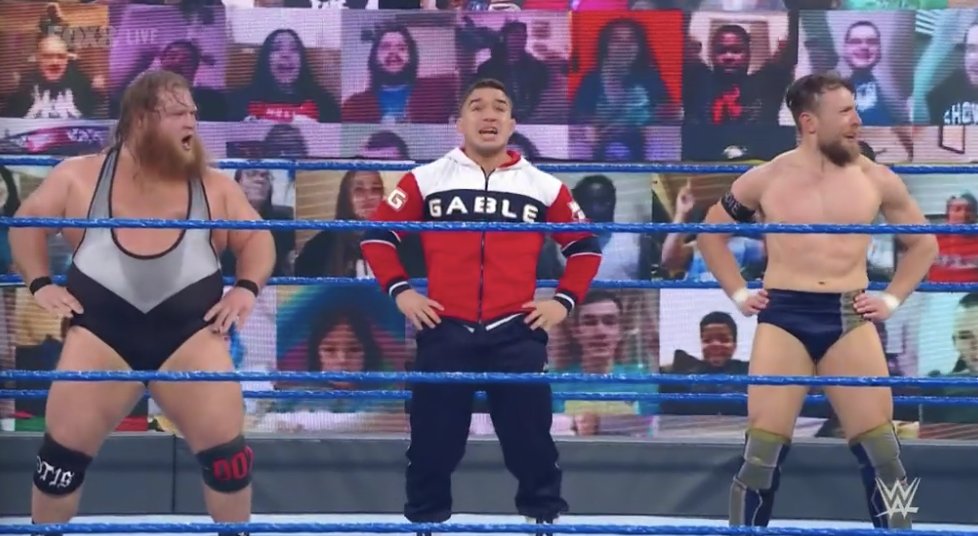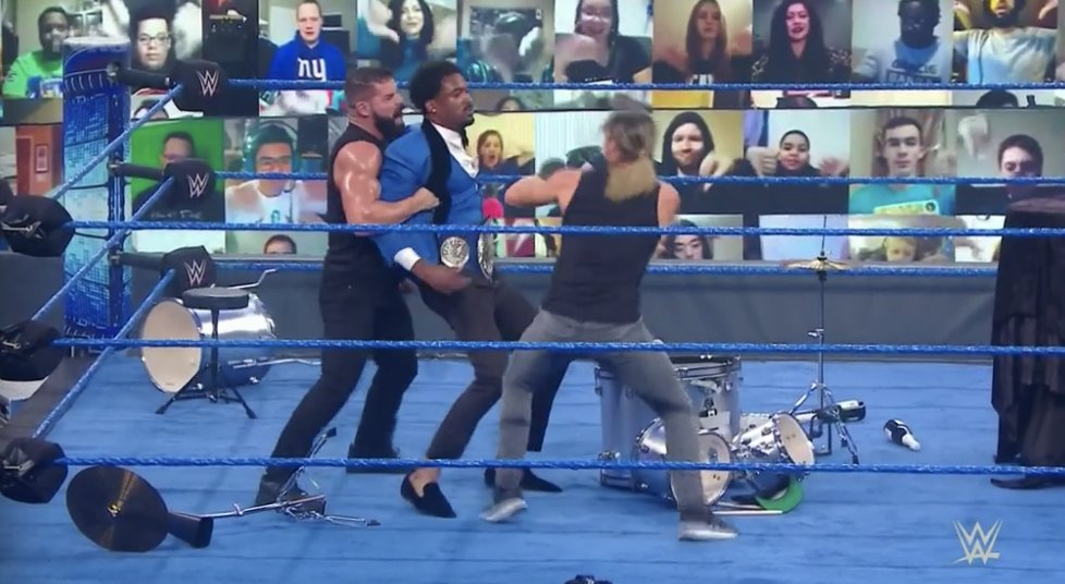 Blake y Cutler también se unen, y aunque Big E logra resistir, ya son tres contra uno y lo atacan en la lona. Llega Apollo Crews, quien logra sacar a Blake, Cutler y arroja a Sami Zayn sobre ellos.