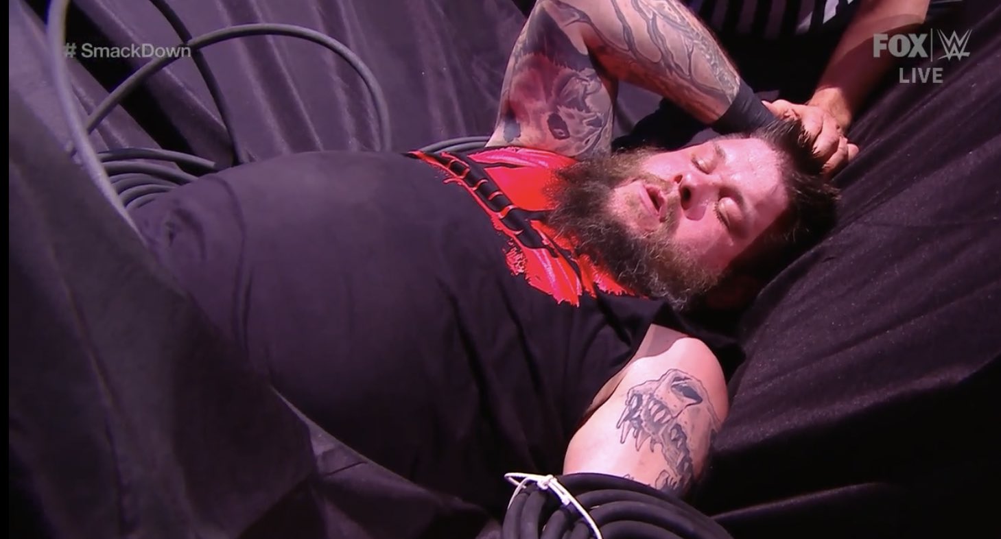 Owens sigue dominando y ahora enfoca el castigo en la pierna izquierda de Jey Uso, quien hasta el momento no logra reaccionar. KO le dice a Jey que es su propia familia la que está provocando todo esto.