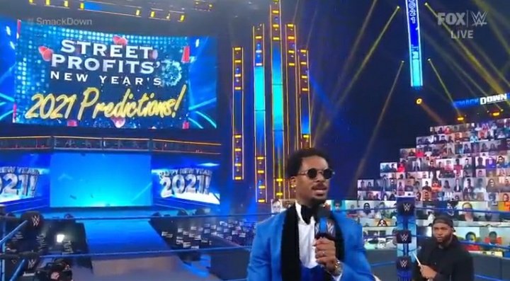 Ahora tenemos la celebración de año nuevo de Street Profits. Hacen un recuento del 2020 y recuerdan que ganaron en Survivor Series a los Campeones Raw, The New Day; además, recuerdan que han ganado dos Slammys. Montez Ford y Angelo Dawkins revelan uno de regalos, y es una batería que Dawkins empieza a tocarla.