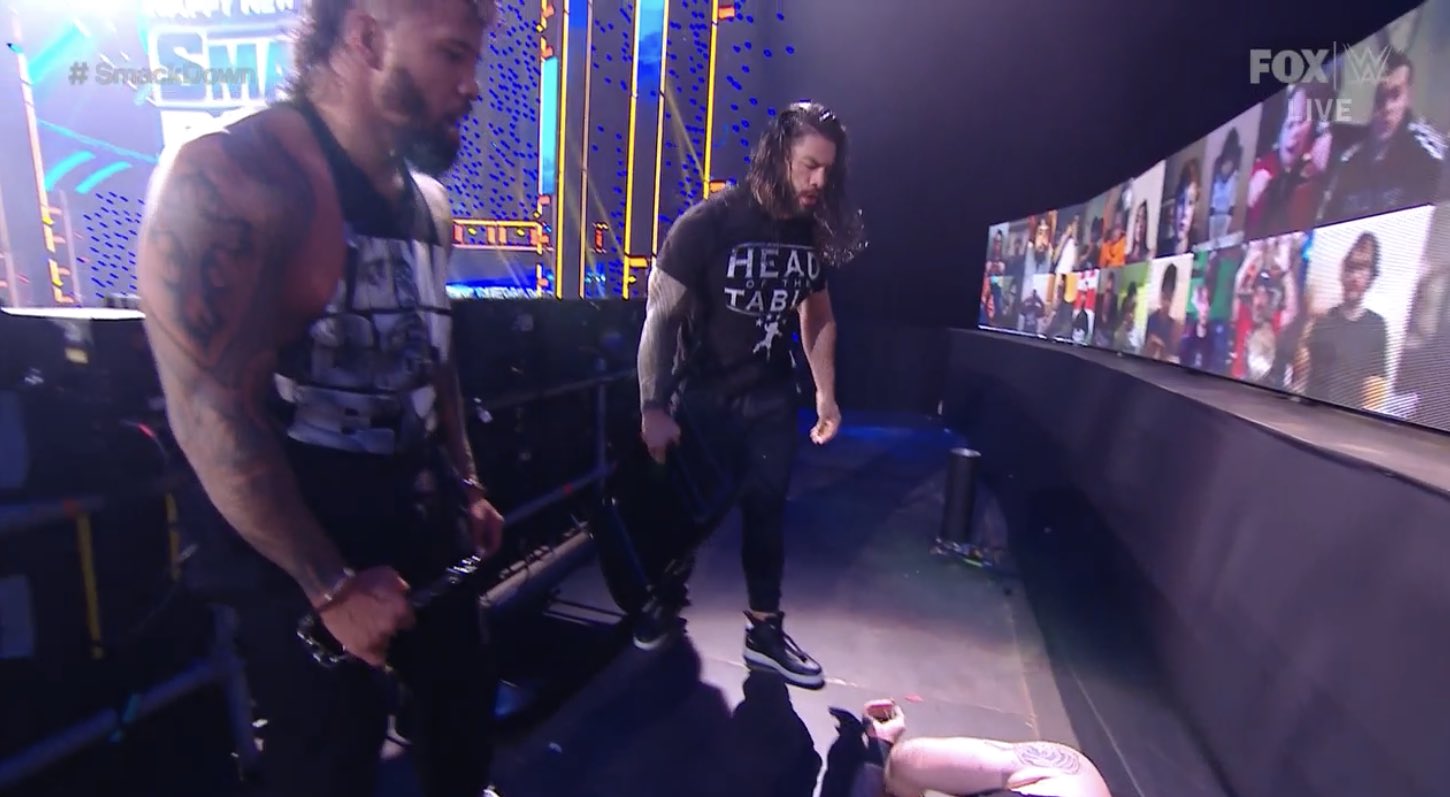 Luego, Reigns continúa el asalto estrellándolo varias veces contra las pantallas, hasta que finalmente lo manda a volar contra la mesa que se encontraba abajo. Los rudos quedan en pie mientras que Owens está tendido y adolorido.