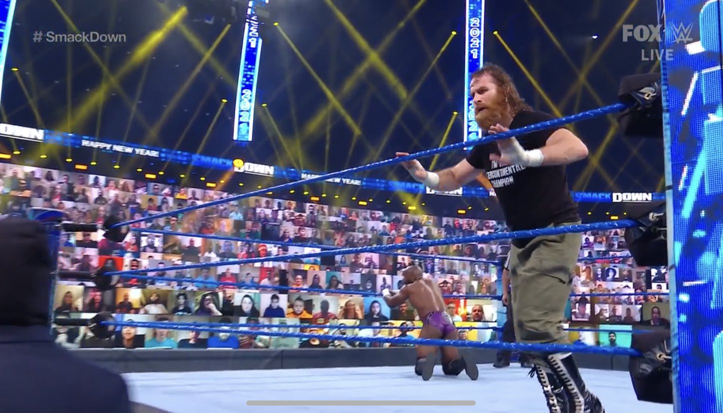 Big E luce un brazalete con el nombre de Brodie, en honor al fallecido luchador de AEW. Corbin viene con sus secuaces y Sami Zayn está en la mesa de comentaristas.