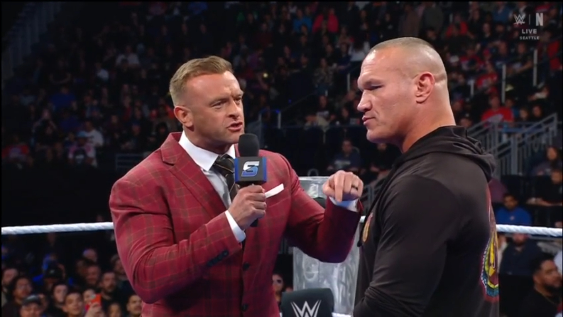 ► Nick Aldis invitó a Orton al ring, asegurando que mantendría todo en un plano profesional al referirse a lo ocurrido. Una vez dentro, Orton tomó el micrófono y le dijo a Aldis que con solo mirarlo a los ojos, sabía que se había tomado el RKO de la semana pasada de forma muy personal.