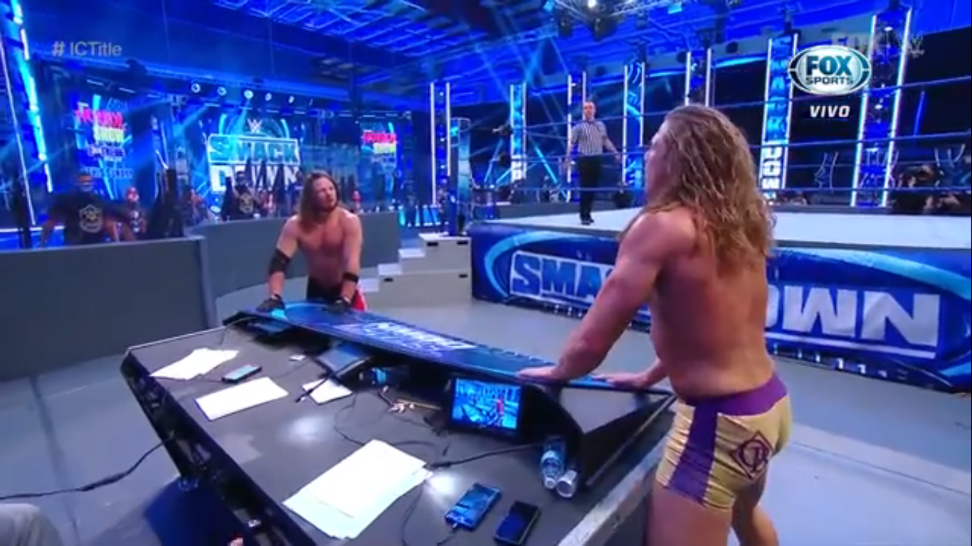 Los rudos, no contentos con la situación, castigan a Big E y buscan una mesa, Kofi se lanza en tope sobre sus rivales y es él quien arma la mesa.
