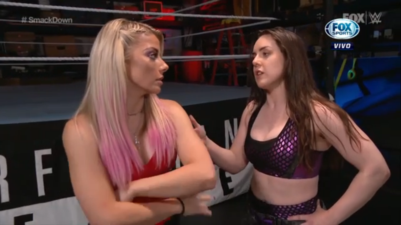 Suena la música de Bayley y aparece ella junto a Sasha Banks. Bayley le dice que Nikki fracasará este domingo y Sasha le dice que regresará a la sombra de Alexa Bliss.