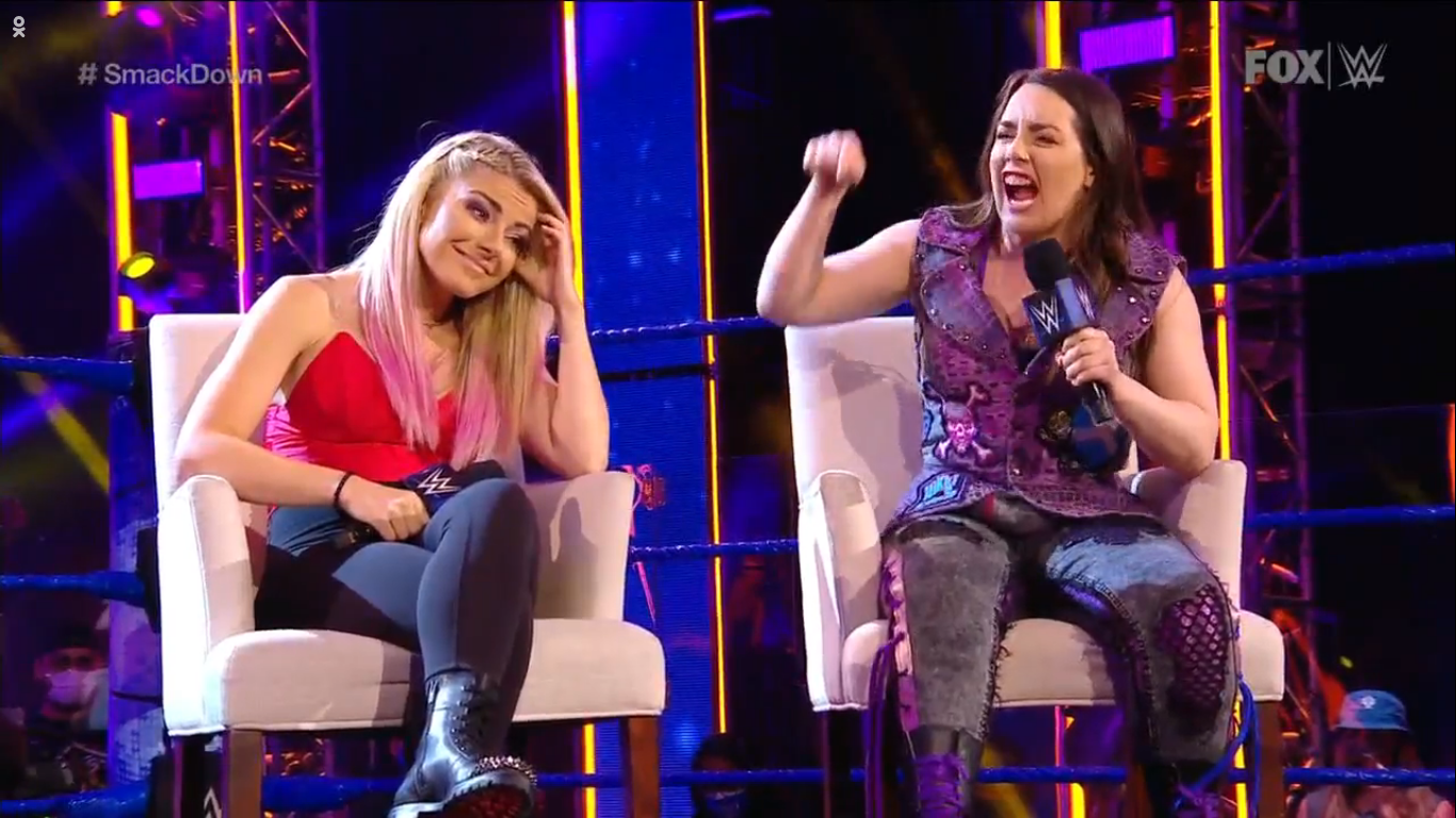 Bayley sube al ring y da su propia predicción: ella derrotará a Nikki Cross y su amiga Sasha Banks derrotará a Asuka este domingo. Alexa les dice que no le dejaron presentar a su invitada especial y esta es Asuka.