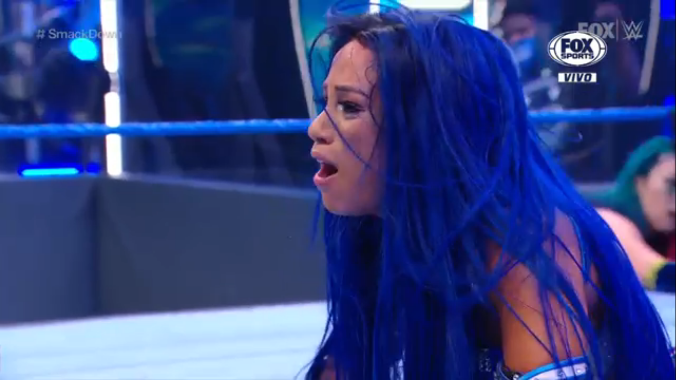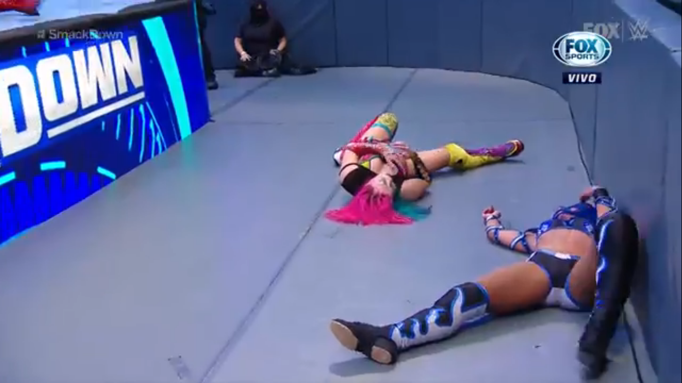 Asuka entra en acción y saca a Sasha fuera de circulación, quien no pudo recibir su relevo.