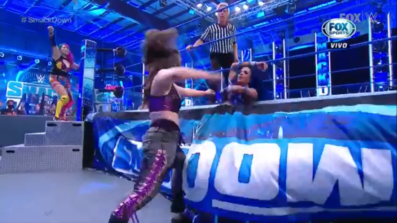 Asuka finalmente toma el relevo y ataca a Bayley y Sasha Banks. Bayley sale del ring y Sasha es dominada y recibe un caderazo.