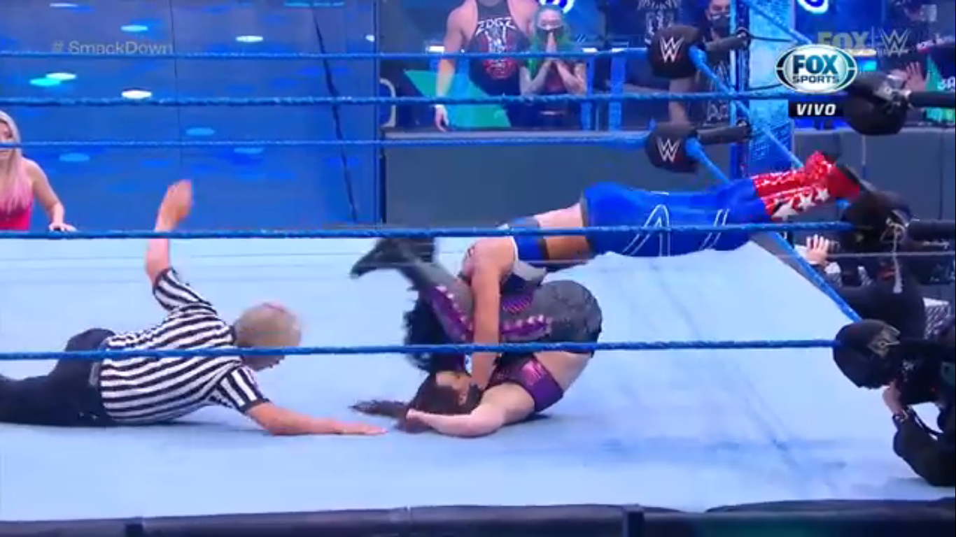 Nikki se lanza en plancha cruzada y falla. Sasha Banks la cubre y logra una cuenta de dos. La jefa no lo puede creer.