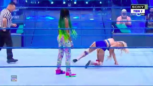 Al volver del comercial, Asuka logra una enredadera y obtiene una cuenta de dos. Sasha contrataca y envía a Asuka al esquinero y aplica un doble rodillazo, para lograr otra cuenta de dos.