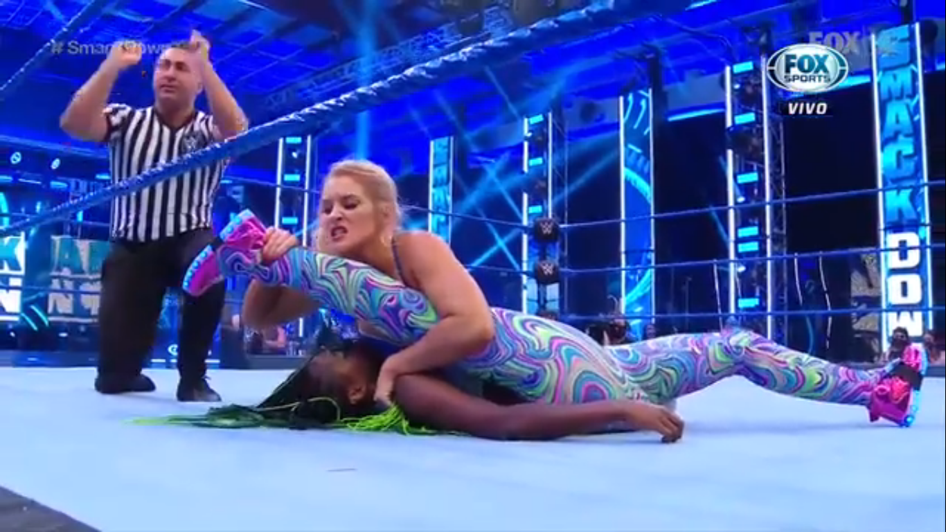 Lacey busca tomar la iniciativa, pero Naomi la envía contra la esquina y toma la iniciativa.