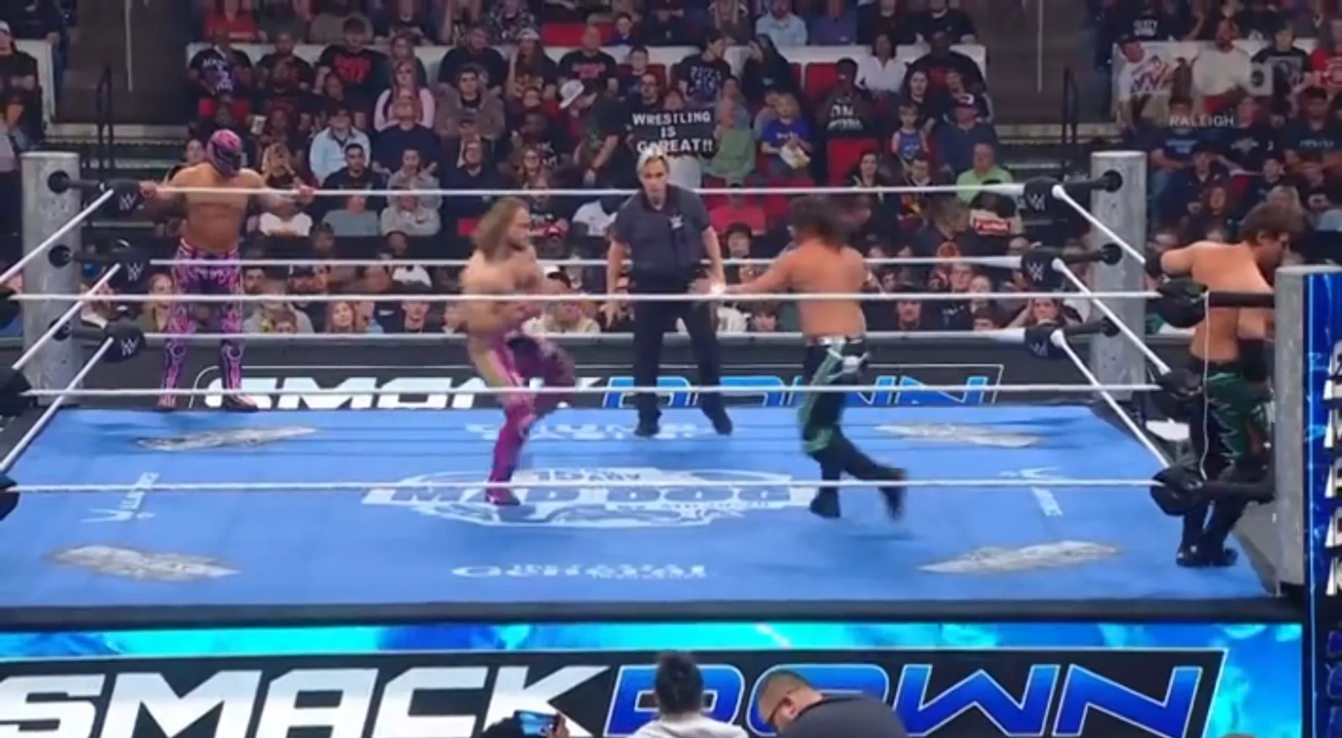 ► Una riña entre Jacob Fatu y Drew McIntyre impidió que hubiera de pronto golpes entre ellos… Fatu atacó fuerte a McIntyre.