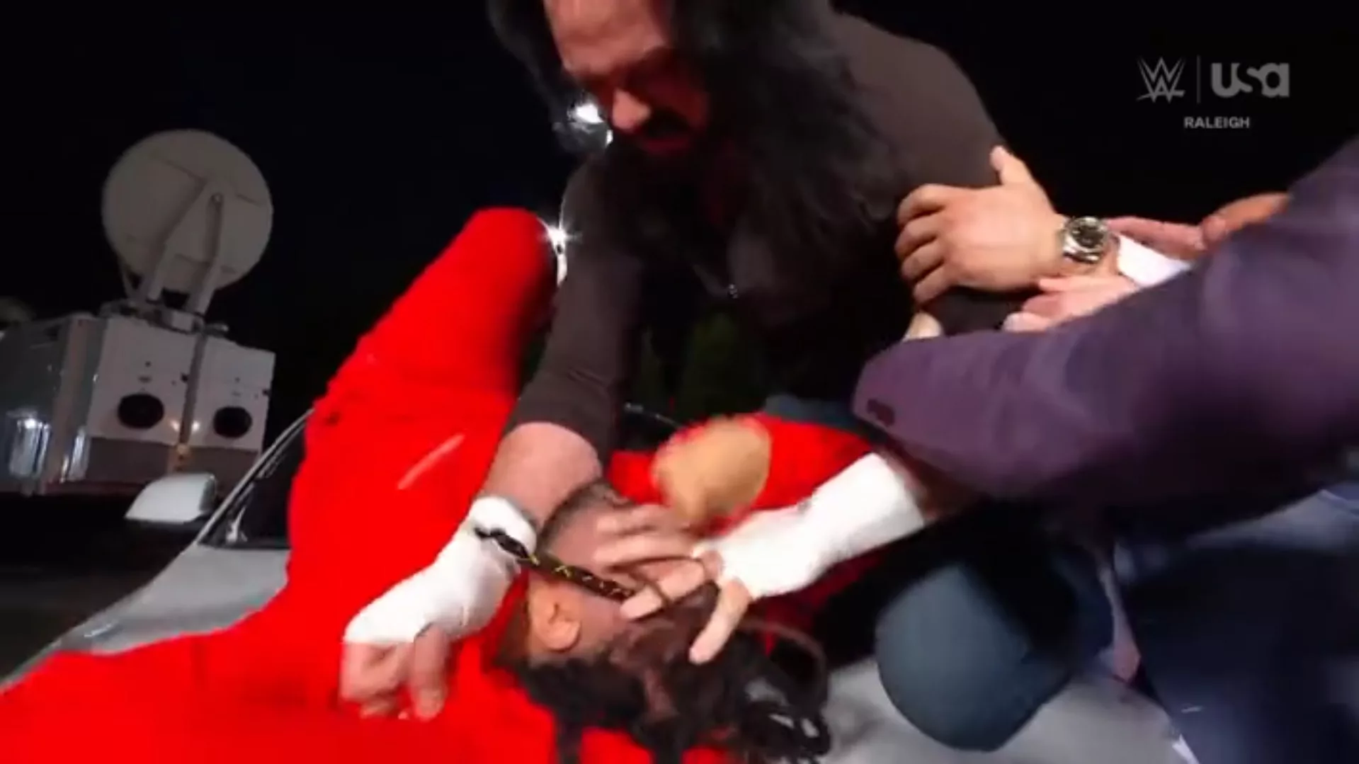 ► La función esta noche abrió fuerte: Drew McIntyre rompió el panorámico de un auto y atacó brutalmente a Jacob Fatu. Varios réferis aparecieron para quitárselo de encima.
