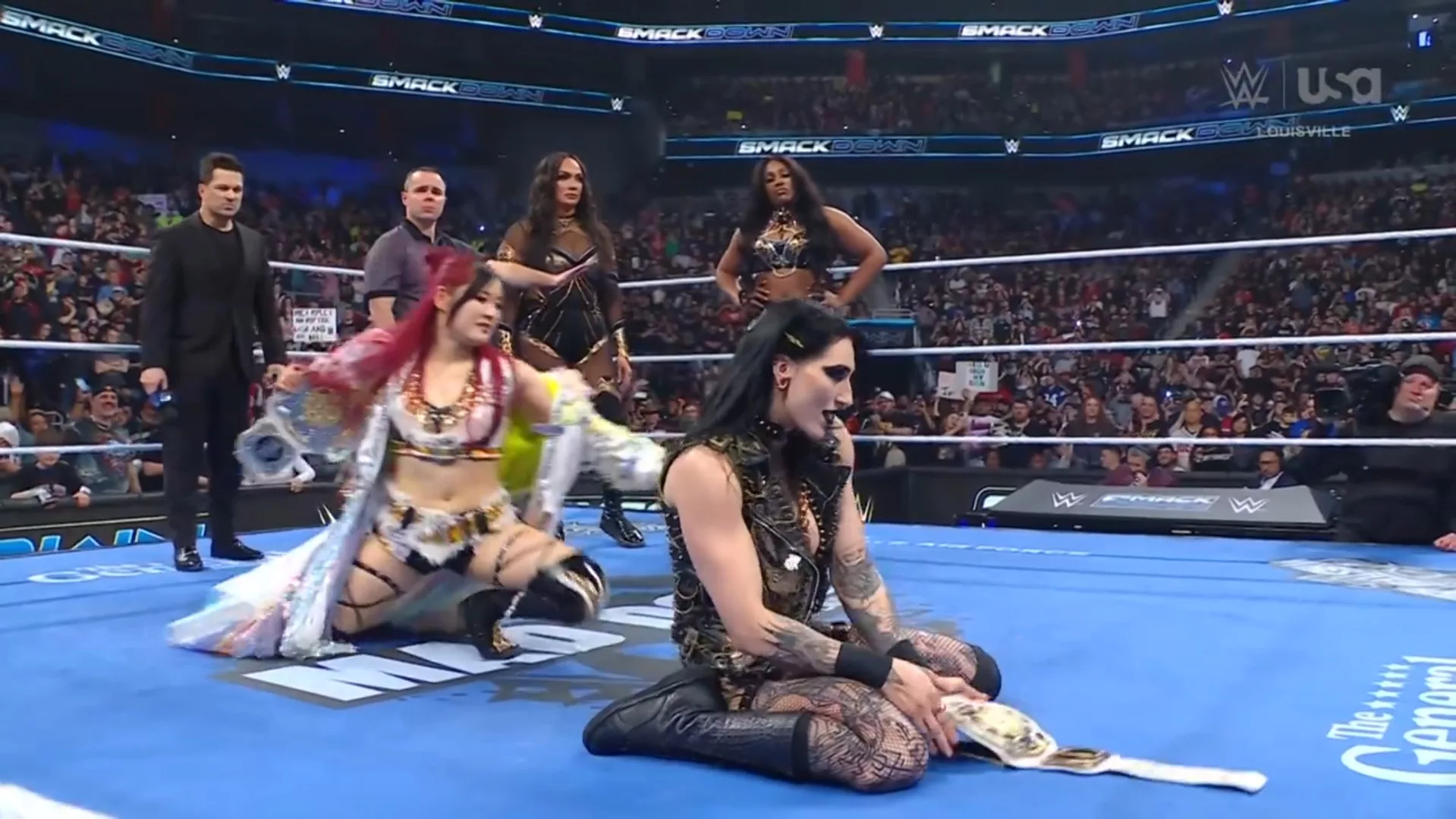 Llegamos a esta lucha porque, durante semanas, ambas se han atacado y golpeado y bueno, Lash Legend y Nia Jax han demostrado ser un equipo poderoso... Sky evitó un lazo al cuello con una voltereta, pero, luego, Legend la elevó en lo alto... Sky le dio patadas voladoras y dio paso a Rhea Ripley, quien la derribó con zancadilla, le tiró encima a la japonesa y logró una cuenta en dos segundos... Ripley y Sky luego se unieron para sacar con patadas voladoras del ring a sus rivales, y caerles encima con patadas voladoras... Además, se lanzaron y querían con un Frankesteiner lastimarlas, pero resultaron ellas arrojadas contra la barricada de protección y contra el suelo de ringside... Más adelante, Rhea Ripley casi vence a Nia Jax tras un tremendo powerbomb... Luego, le cayó encima con bala de cañón hacia fuera del encordado... Tras comerciales, Lash Legend arrojó de cara contra el esquinero LED a Ripley y Jax le dio una zambullida samoana a la australiana sobre la mesa de comentaristas en inglés, aunque no se rompió la mesa... Legend le hizo una plancha y la cuenta llegó a dos... Sane con una corbata, sacó a Legend del ring... Ripley se apartó y Nia se dio duro en el hombro contra el esquinero LED... Sky y Legend se dieron con todo, Legend mandó en catapulta a Sky, pero esta le cayó encima a Nia y la sacó del ring... Iyo pateó la cabeza de Legendy y le cayó encima con patadas voladoras... Luego, Iyo con tope suicida conectó a Jax y luego, remató con meteora en el esquinero a Legend... Los fans corearon '¡Esto es genial!'... Over The Moonsault y Sky casi gana, de no ser por Nia Jax en el último segundo evitando la tercera palmada del réferi... Jax con el aNIAlator sobre el pecho de Iyo, pero Sky sacó del ring a Legend y evitó también la derrota... Tras cabezazo, Ripley atacó a Jax con el Riptide, pero la legal era Legend y atacó a Ripley con su Lash Extension para ganar la lucha y el campeonato.