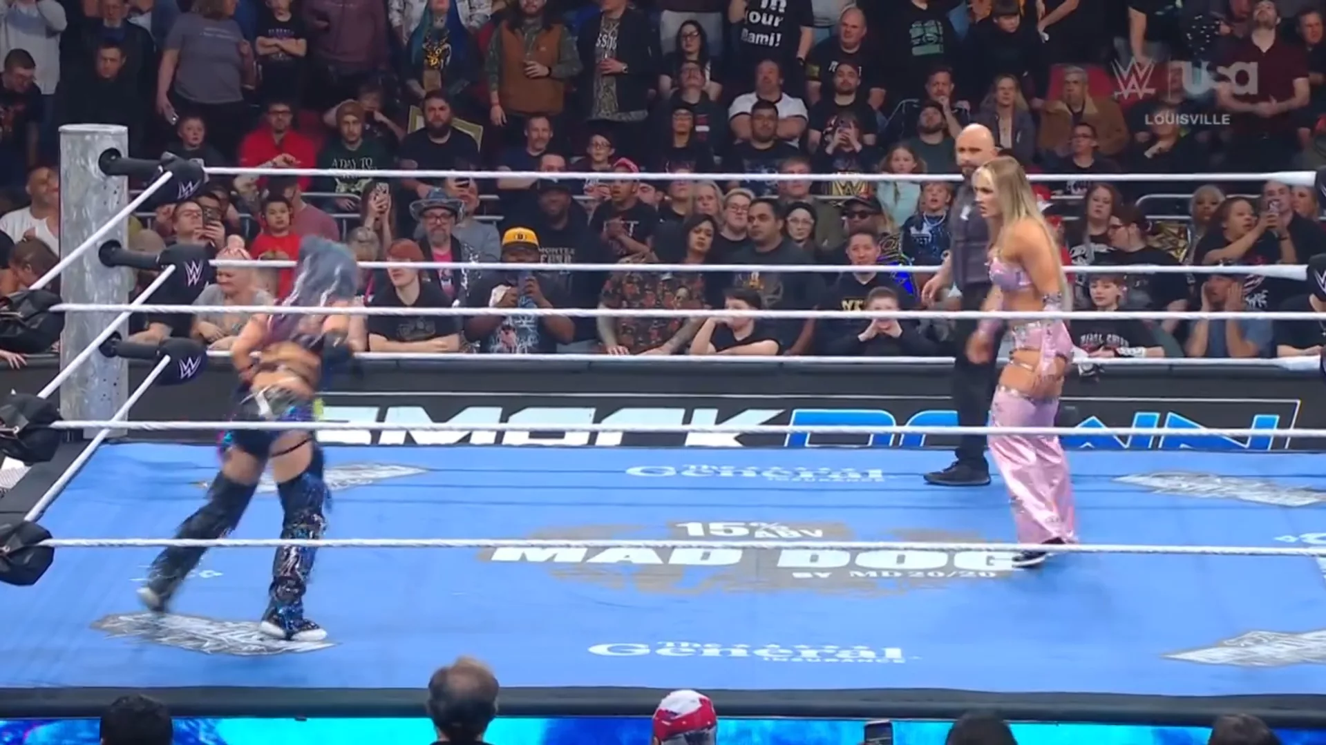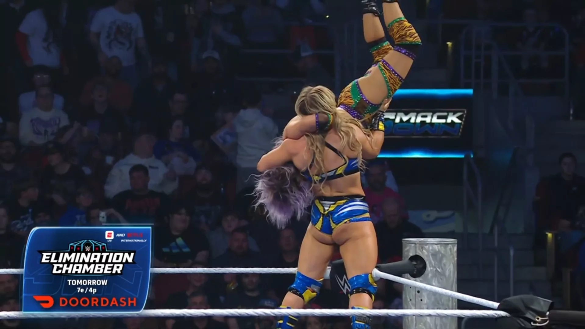 Aunque Asuka es parte de Raw de manera oficial, esta noche se enfrentó a Tiffany Stratton, de SmackDown, pues Triple H consideró que era una buena idea para promocionar la lucha en donde estarán mañana ambas: la Cámara de la Eliminación femenil, que, al igual que el evento premium en general, no ha generado mucha expectativa... Pues, no se sabe si funcionará esto, pero sí se supo que ambas dieron una buena contienda... Antes de la lucha, Asuka tomó micrófono para anunciar que quien iba a luchar era Kairi Sane y ya no ella, como estaba anunciado, pues ella quería descansar y también darle chance a Kairi, pues era el Kairi Time... La campana sonó y Kairi se le fue encima, pero rápidamente Tiffy la llevó a la lona, saltó con las rodillas en las sogas y se impulsó para caerle con las rodillas encima a Kairi... Stratton realizó varias volteretas para liberarse de Sane, aunque esta con una corbata la mandó a volar... Stratton luego castigó con el trasero en la espalda a Kairi... Stratton voló y castigó a Kairi, luego, Asuka la distrajo y Sane la arrojó de cabeza contra el poste del esquinero... Más adelante, Kairi atacó con doble pisotón a la cara a la rubia, saltando desde el esquinero, pero la cuenta llegó a dos... Sane revirtió un golpe al último minuto y atacó a Stratton con un buen DDT sobre la ceja del ring... Sane voló con un puñetazo y casi gana la contienda; llegó solo a dos... Stratton empujó a Kairi desde el esquinero y esta cayó sobre Alba Fyre, lo que enojó a Chelsea Green... Sane voló, pero Stratton se quitó a último minuto y cayó sobre Chelsea... Stratton se rio de ella... Luego, con un azotón de espaldas contra la lona y con el Prettiest Moonsault Ever, Stratton se llevó la victoria.