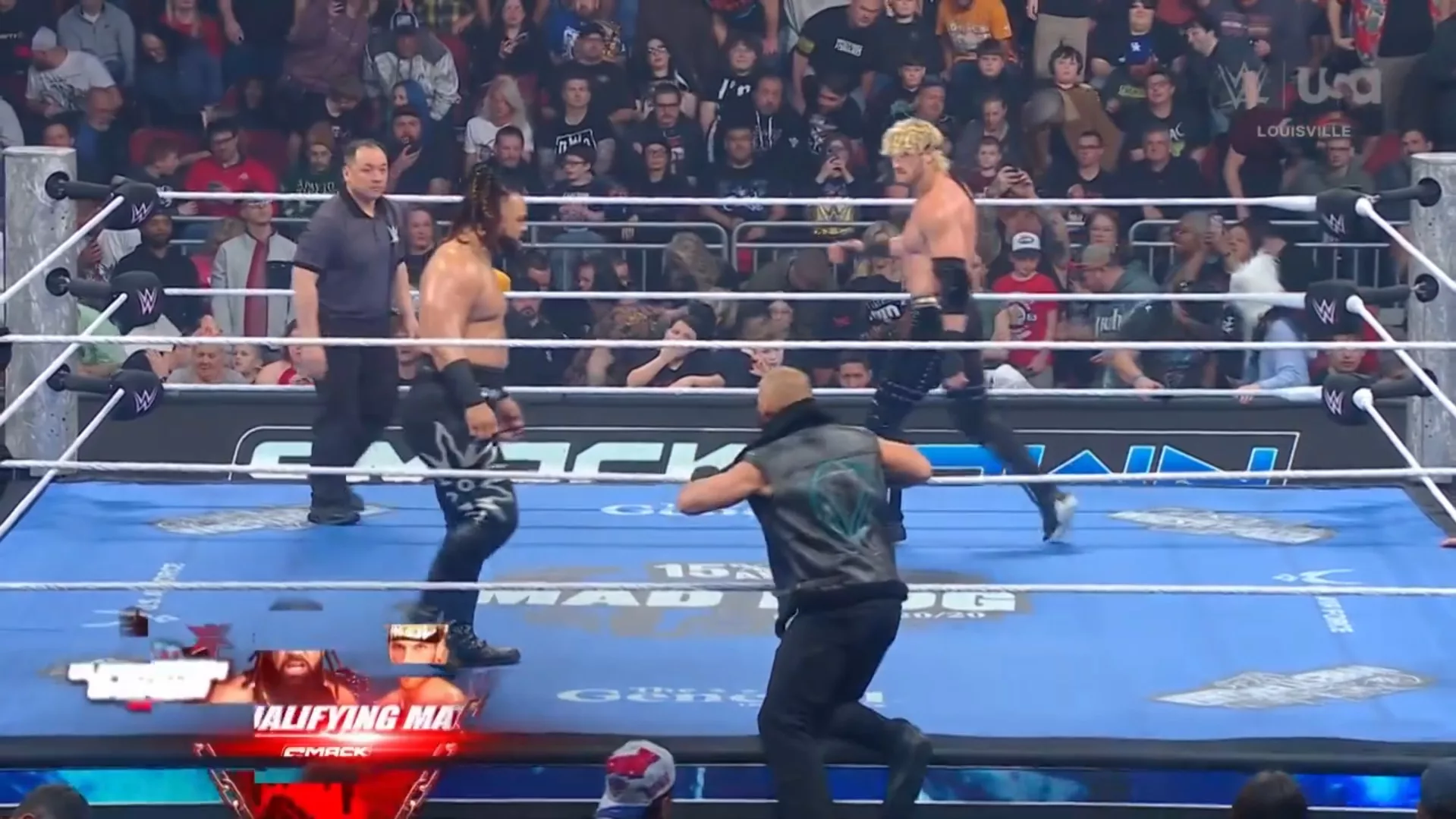 Con lo ocurrido al inicio del show, en donde alguien atacó brutalmente a Jey Uso y tuvo que ser sacado de la arena en ambulancia, quedó libre un cupo para mañana en la Cámara de la Eliminación 2026, y Adam Pearce determinó que el cupo se daría al ganador de este combate... La lucha empezó con Theory distrayendo a Fatu, para que Logan lo golpeara, pero no sirvió de mucho, pues este reaccionó con su acostumbrada violencia y llevó al esquinero a Logan, donde le dio varios derechazos... Luego, lo remató con raquetazos y bofetadas al pecho... Fatu aplastó a Logan en el esquinero con lazo al cuello; luego, lo sacó del ring con un lazo y le cayó encima con tope suicida... Durante comerciales, Fatu dominó a Logan con gran fuerza, hasta que Logan se metió al ring, distrajo al réferi, y Theory le dio una buena paliza... Logan luego le hizo su guillotina al pecho y casi gana el combate... Logan arrojó duro de cara contra el esquinero a Fatu, le hizo un Zig Zag y la cuenta llegó a dos... casi gana... Fatu reaccionó con una superkick y con una plancha; la cuenta quedó solo en dos... Logan luego con un moonsault impulsado desde las sogas, casi obtiene la victoria... Fatu con una superkick mandó a Logan al esquinero, le dio un ataque con la cadera en la cara... Y una superkick a Theory... Luego, tomó a Heyman del traje; el réferi intervino... Logan Paul le dio un golpe bajo a Fatu, un puñetazo a la cara y con un Frog Splash, casi obtiene la victoria... El misterioso hombre enmascarado apareció y atacó a Theory con una superkick... Logan Paul le dio un derechazo... Y le quitó la máscara, siendo un tipo random que nadie conoce... La seguridad y los réferis aparecieron para sacarlo... Logan aprovechó la distracción, pero Fatu lo sorprendió con una zambullida samoana... Sin embargo, Drew McIntyre le dio en la cara con el Campeonato WWE a Jacob Fatu cuando este se iba a lanzar con su moonsault, y Logan Paul solo tuvo que cubrir para ganar a Jacob Fatu y clasificar a Elimination Chamber 2026.