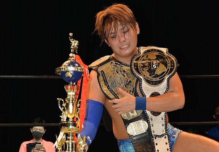 5. Junior Double Crown: Shoki Kitamura vencieron a HUB (c) (13:49) con un Dharma-Style German Suplex Hold – conquistando el título.